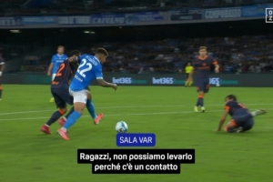 VAR: "確實,迪洛倫佐有介入,但他介入是因為一個動作……他并不是為了爭取不屬于球的空間而伸腿,而是為了保護球而伸腿。我們來看一下姆希塔良的動作,稍等。看看迪洛倫佐的臉,他正保護著球。稍等一下,我在核實?!?/p>