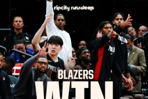 賽后,開拓者官方分享本場比賽贏球海報,鏡頭給到慶祝時的替補(bǔ)席,楊瀚森和利拉德入鏡。