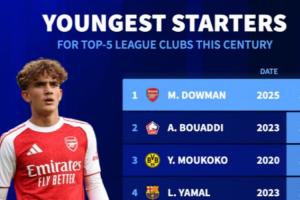 15歲天才載入史冊!道曼成五大聯(lián)賽本世紀(jì)最年輕首發(fā),亞馬爾第4