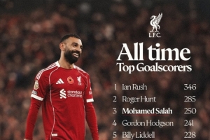 利物浦官方社媒曬出了隊(duì)史射手榜,薩拉赫以250球排名第三位,距離首位伊恩-拉什差96球。