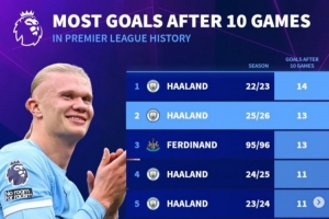 在德轉列出的英超歷史前10輪進球榜中,前五哈蘭德占據(jù)四席,22-23賽季前10輪進14球,為歷史最多。
