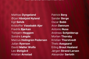 中前場(chǎng):阿恩斯塔德(奧胡斯)、帕特里克-伯格(博德閃耀)、桑德-博格(富勒姆)、鮑勃(曼城)、冬納姆(圖盧茲)、努薩(萊比錫)、謝爾德魯普(本菲卡)、托斯比(熱那亞)、托爾斯特韋特(薩索洛)、阿斯高(流浪者)、哈蘭德(曼城)、拉爾森(狼隊(duì))、瑟爾洛特(馬競(jìng))