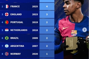體育資訊11月5日訊 巴黎圣日耳曼小將杜埃贏得了2025年金童獎,德轉盤點了各國球員贏得金童獎次數(shù),西班牙以5次居首。