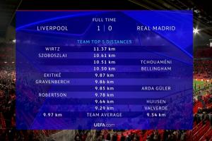 體育資訊11月05日訊 利物浦本輪歐冠1-0擊敗皇馬。賽后官方跑動數(shù)據(jù)出爐。