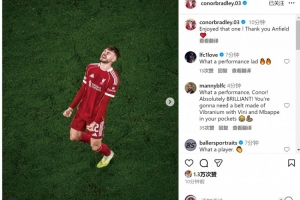 布拉德利當(dāng)選本場比賽利物浦隊(duì)內(nèi)最佳球員,賽后他在社交媒體上曬出照片,配文:“享受這場比賽,謝謝安菲爾德。”