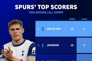 德國轉(zhuǎn)會市場統(tǒng)計了本賽季熱刺隊內(nèi)球員的進球數(shù)量,并列出榜單,中衛(wèi)范德芬6球居首。