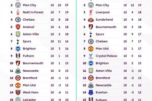 體育資訊11月06日訊 英超官方社媒更新動(dòng)態(tài),官方曬出了24/25賽季和本賽季聯(lián)賽在10輪過后的積分榜情況,并配文:你注意到了什么?