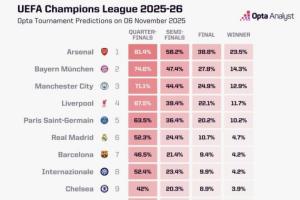 歐冠奪冠概率:阿森納超23%斷檔領(lǐng)跑,拜仁曼城紅軍巴黎皇馬2-6位