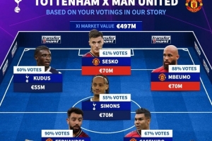 體育資訊11月8日訊 北京時(shí)間今天晚上20點(diǎn)30分,熱刺將在英超第11輪比賽中主場對陣曼聯(lián)。德國轉(zhuǎn)會市場根據(jù)關(guān)注者的投票列出熱刺+曼聯(lián)陣容,B費(fèi)、舍什科、西蒙斯、范德芬在列。