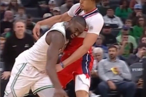 發(fā)際線粉事件之一:對陣奇才時(shí)杰倫·布朗發(fā)際線粉粘到對手白T上