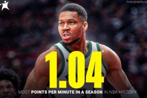 此役過后,雄鹿當(dāng)家球星揚(yáng)尼斯·阿德托昆博本賽季場(chǎng)均得分上漲至33.8分,場(chǎng)均出場(chǎng)時(shí)間為32.3分鐘,他上場(chǎng)每分鐘能得到1.04分,追平了NBA歷史記錄!