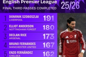 英超進(jìn)攻三區(qū)成功傳球榜:索博壓安德森居首 賴斯、B費(fèi)、恩佐在列