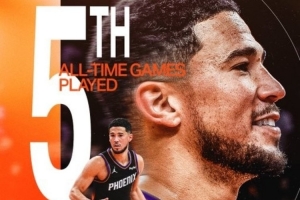 這是布克太陽生涯的第684場比賽,超越凱文·約翰遜獨(dú)居隊史第五位,排在他前面的是迪克·范-阿斯代爾。