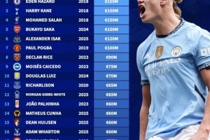 英超各隊(duì)球員歷史最高身價(jià)排行:哈蘭德2億歐居首,4人1.5億歐