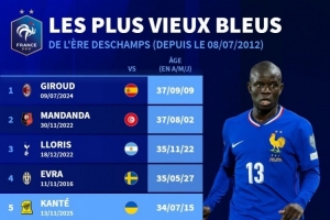 體育資訊11月15日訊 世預(yù)賽歐洲區(qū)比賽,坎特踢滿全場(chǎng),幫助法國主場(chǎng)4-0擊敗烏克蘭,德轉(zhuǎn)列出了德尚執(zhí)教法國隊(duì)以來年齡最大出場(chǎng)球員排名,吉魯居首,坎特排在第5位。